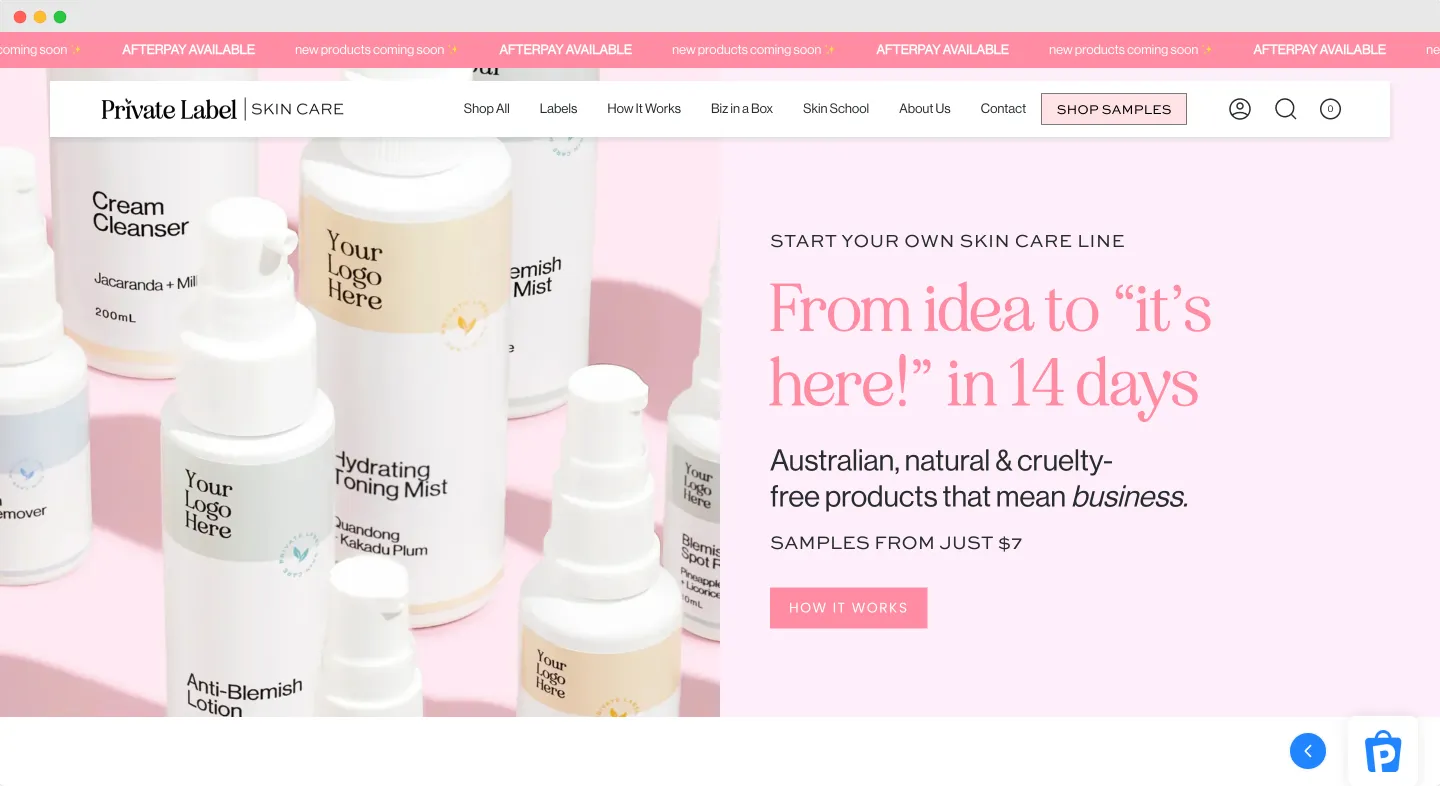 Private Label Skin Care Australia offers a straightforward entry into the skincare business with a refreshingly transparent approach. They’re providing clear pricing and detailed product information directly on their website. The downside might be their prices, since they seem pretty high — e.g. a cleanser in a plastic bottle costs around 17$. Customization is limited to stock formulas and packaging, which might not suit brands aiming for exclusivity.