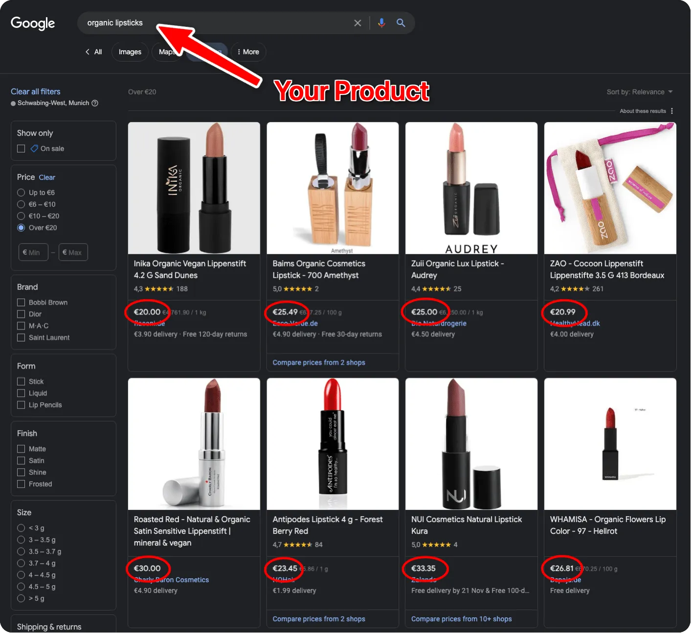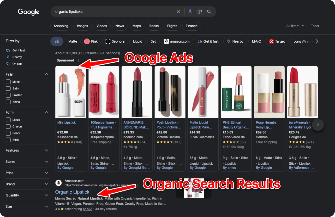 As you can see, the first search results are marked with “Sponsored”. This means that these brands run Google Ads for the keyword “organic lipsticks”, so their lipsticks show on top of the search results for this specific search query.