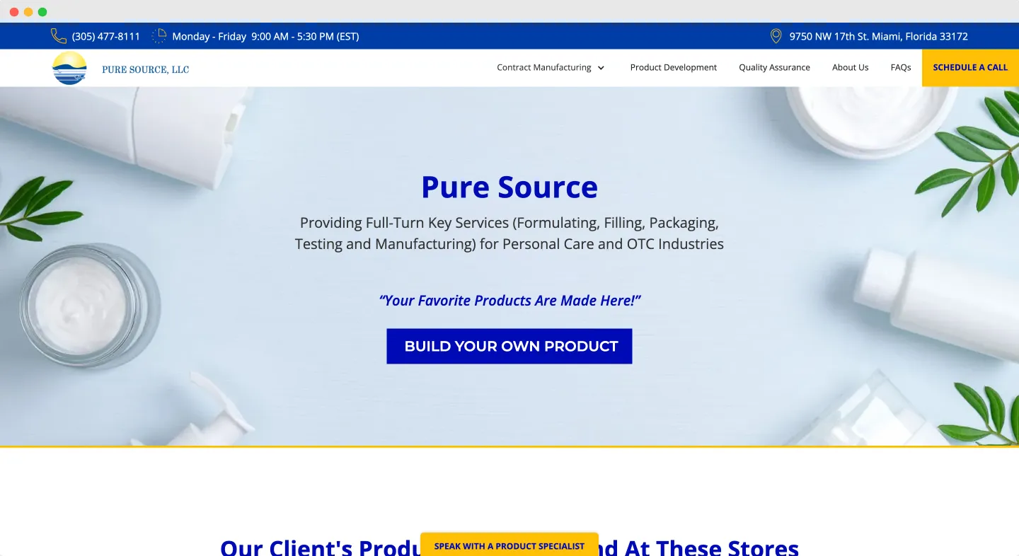Pure Source, founded in 1995, is a contract manufacturer specializing in the production of Creams, Lotions, Liquids, Gels, Sprays, and more. For more than 28 years, they operate GMP-certified and FDA inspected facilities. While they do not offer any ready-to-go sunscreens, you can develop your very own sunscreen together with them. The only downside is their comparatively high minimum order quantity of 5,000 pieces.