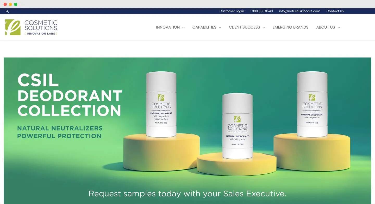Cosmetic Solutions is a US-based OEM cosmetics manufacturer offering turnkey private label skincare services, contract manufacturing and custom formulations. They also offer branding and marketing services, but with all due respect, given their own website and design, you should definitely get some references beforehand.